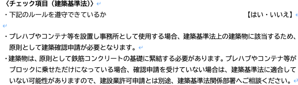そうなると、実質的にプレハブやコンテナ等を営業所としている場合は、建築確認の申請をしていることが前提条件になります。