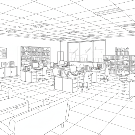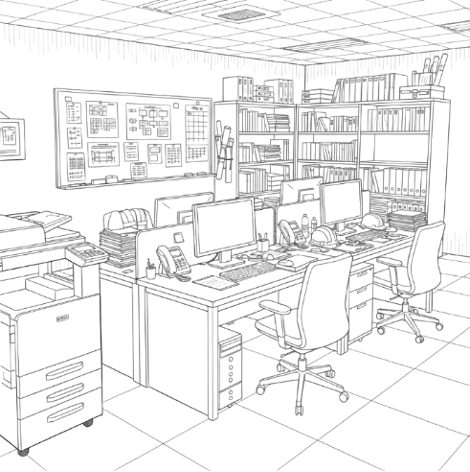 • 事務机、椅子、電話機、パソコン、プリンター(複合機)、各種台帳など、主要な事務用品が写るように事務スペースをアップで撮影すること