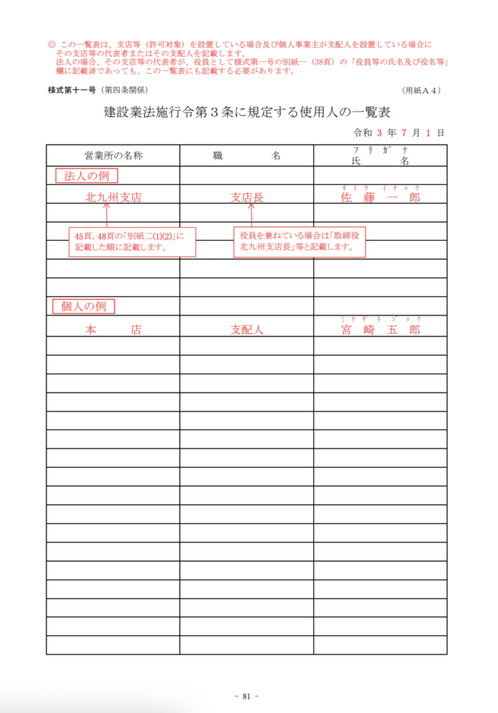 一般的には営業所長・支店長が該当するケースが多いものの、役職名が異なっていても、要件を満たし、かつ 様式第11号(建設業法施行令第3条に規定する使用人の一覧表) に記載して申請していれば、令3条使用人として認められることになります。
